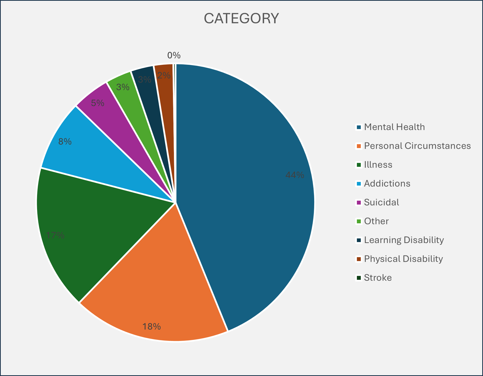 This graph shows how mental health is affecting our clients that have gambling related financial harm, with 44% of all disclosures also expressing the impact on mental health and almost 5% are struggling with suicidal thoughts and ideation. Personal circumstances are also prevalent within this cohort of clients, and includes relationship breakdown, job loss and increasingly domestic and economic abuse – creating that toxic trio and perfect storm – all of which could be the root cause of the gambling related financial harms- not forgetting of course the impact on financial resilience that will be affecting all clients.